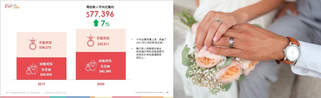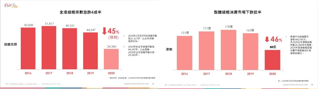 政府統計資料顯示,2020年1月至9月的結婚宗數為17,117宗,比去年同期急跌45%。疫情反覆令經濟復甦不明朗,然而,本年結婚消費調查顯示,新人的結婚平均開支預算只是輕微下跌2%至港幣360,545元,回復至2018年水平,反映即使面對疫情陰霾,已計劃結婚及籌備已久的新人仍預期疫情將會受控,打算維持消費,無阻新人為一生人一次的人生大事締造難忘回憶。