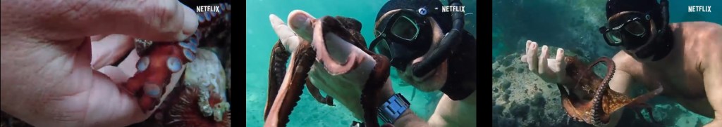 可惜,章魚只有一年壽命。但這一年,男主角不斷觀察她的進食、動作、避開捕食者和變色的皮膚。有時她甚至會會兩隻爪當成腳,模仿人類走路姿勢。有一次,一隻鯊魚追捕她,最後她其中一隻爪被咬斷,男主角十分傷心。他恐怕受重傷的她,已沒有力量捕食生物,會因此死後。但令他驚訝的是,她的斷肢位置竟然生出一隻「小爪」,慢慢甚至成長得成熟,像沒有受過傷似的。這場景令男主角想起自己的人生困難,對比這隻章魚面對的生死關口,自己的算不得甚麼,而且柔軟的她比自己更堅強,能有自我修復的機制,能在重大打擊後,有強大的重生能力。這事深深影響他。