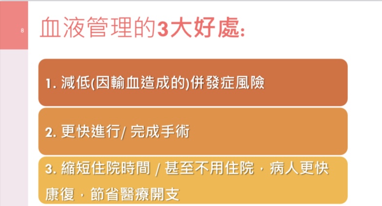 香港臨床血液管理學會主席、麻醉科專科周雨發醫生指出,「病人血液管理」是近10年發展的醫療新方向,手術前先針對營養及體能來改善患者的貧血情況,並配合先進的醫療科技來減低手術期間的失血風險。