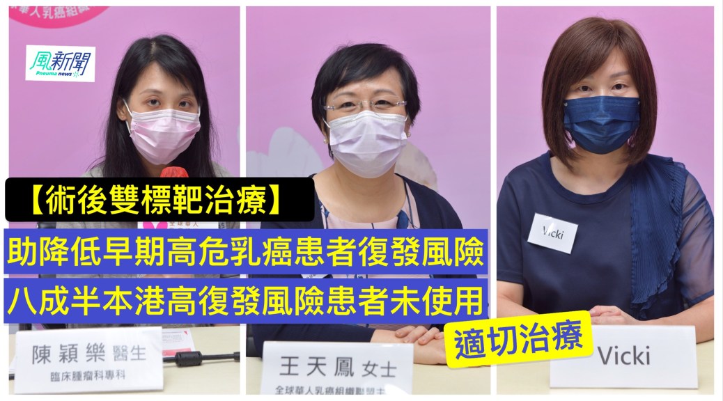 乳癌是本港女性頭號殺手之一,發病率持續上升,由2000年約2,000宗大幅飆升逾一倍至2018年的4,600多宗,每年逾700人死亡。當中「較惡」的HER2型乳癌約佔20%,由於其癌細胞生長及擴散速度較快,復發率及死亡率亦較高。臨床腫瘤科陳穎樂醫生認為,香港至今尚未將術後雙標靶治療納入藥物名冊,勢必影響醫生的治療決定,因此建議政府應盡快與國際治療指引接軌,將術後雙標靶藥物納入常規治療,並為患者提供醫療的資助。
