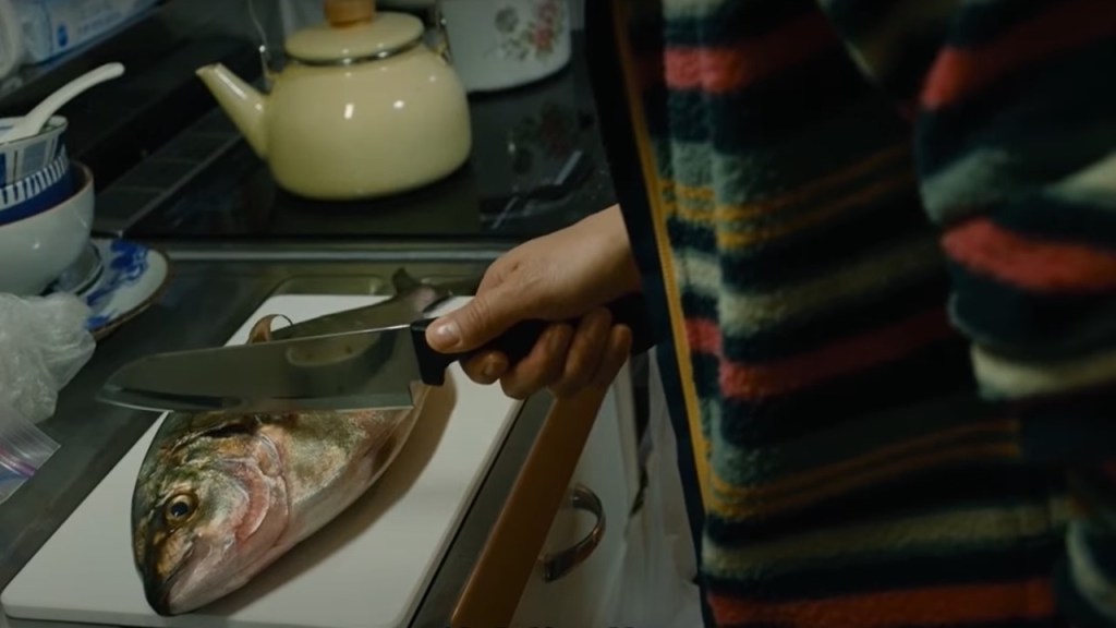 電影透過這一幕,向觀眾介紹這家人。媽媽是家庭主婦,膽小怕事,不敢劏魚,看見菜蟲也會大叫。爸爸是外出工作的大男人,在工作上被老闆任意指點,一回家就重拾「老闆」角色。他只是坐下看電視,不參與任何家務,不幫老婆劏魚,連盛飯也要老婆幫忙,十問九不應。在沙發上,他放下工作時戴著的假髮。女兒是典型少女,十分愛美,連洗澡都戴著假眼睫毛,忘記除下,常常拿著手機看。兒子不愛吃住家飯,只吃快餐。