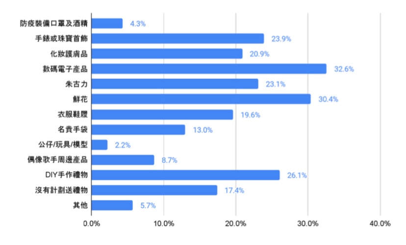 調查結果亦給女士一個貼士。原來男士有54.3%最想收到數碼電子產品作為禮物,其次有38.8%希望收到來自女方的DIY手作禮物,第三位則是衣服鞋履(36.8%);而女士 (42.9%) 最想收到男方的DIY手作禮物,其次是手表或珠寶首飾(37.5%),第三位是鮮花(28.6%),第四位是名貴手袋(26.8%)。