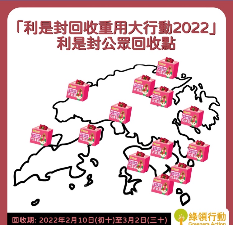 疫情下,虎年在沒有堂食的年夜飯悄悄度過,社會節日氣氛大減,但派利是這習俗並沒有消失,而綠領行動連續13年舉辦的「利是封回收重用大行動」,已於2月10日起正式展開。該會今年的回收計劃有92間機構支持,由即日起至3月2日,在全港各區提供超過300個利是封收集點,方便市民回收。