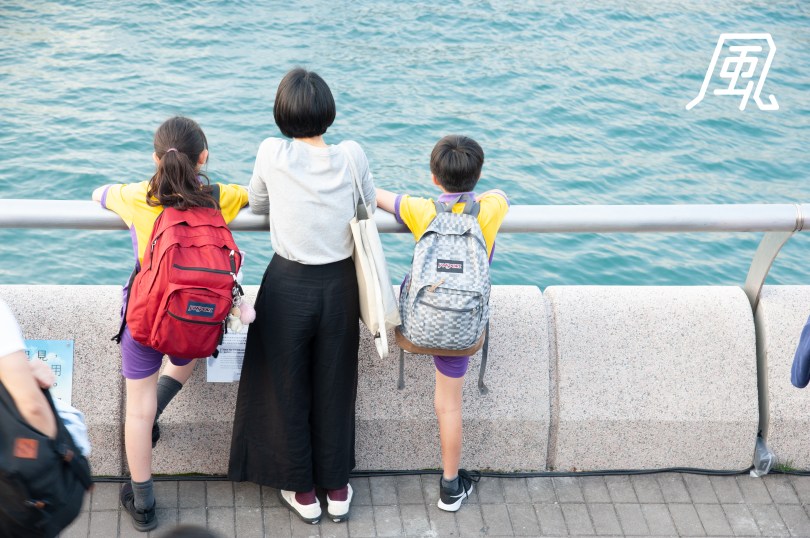 孩童沉重的書包,跟海上浮游輕飄飄的kaws,成強烈對比。