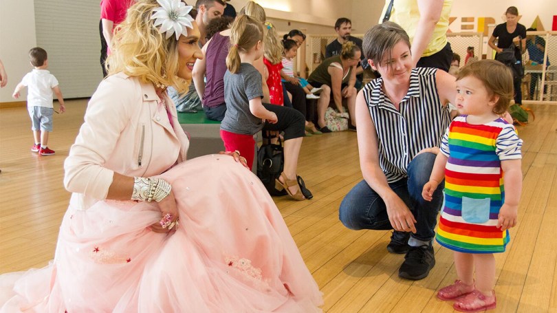 以妖艷女性衣飾打扮的男子向小孩講童話故事。(圖片來源:www.dragqueenstoryhour)