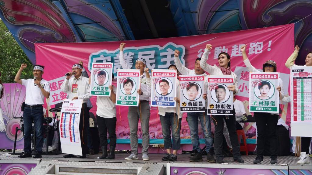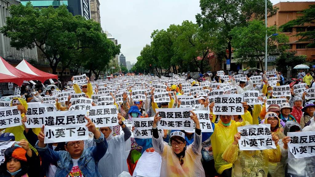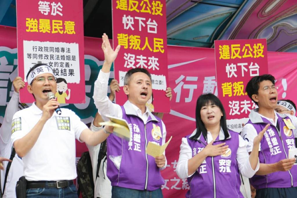 挺同、反同雙方團體在立法院針對同婚專法展開朝野協商及審查「公投法修正案」前夕的5月8日總動員上街遊行。代表反同婚的「幸福盟」匯集約萬名民眾,在立法院大門舉行集會,呼籲讓民法婚姻限定一男一女,為同性伴侶另立《同性共同生活法》方案,亦即要求政府尊重去年底人民公投的結果。民眾在現場高呼口號,要求違反公投結果的立委和總統蔡英文下台。
